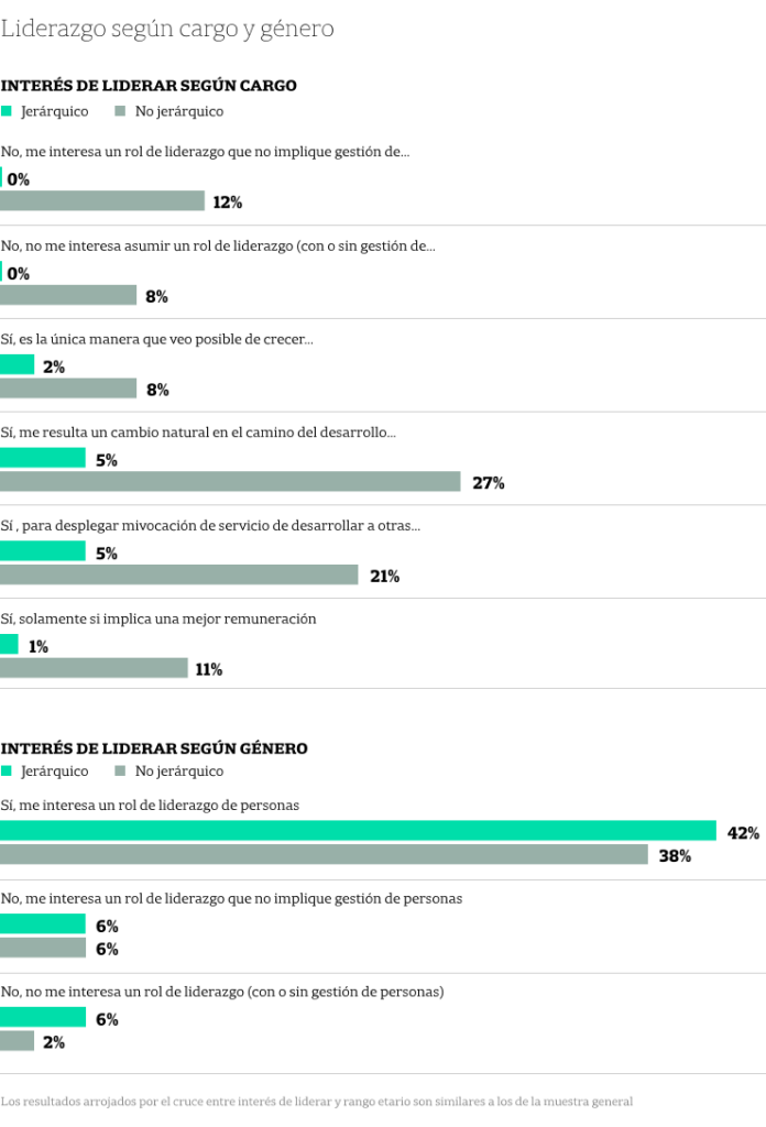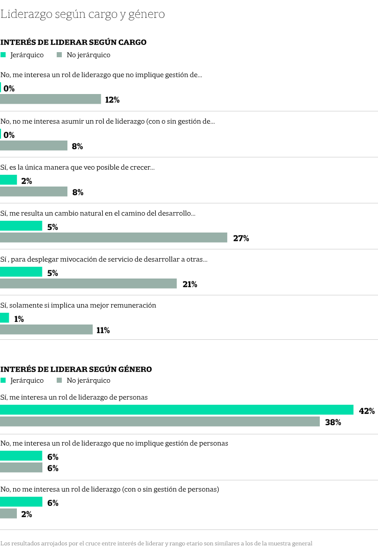 Desglosado según género, el 38% de las mujeres manifestó interés por un rol de liderazgo de personas mientras que en el caso de los hombres fueron el 42%. En ambos casos, un 6% respondió que le interesa un rol de liderazgo que no implique gestión de personas.