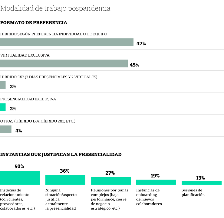 Entre los principales resultados del estudio de IDEA Joven se encuentra que el 47% de los jóvenes tiene preferencia por un formato híbrido de trabajo, seguido por un 45% que elige la virtualidad de forma exclusiva.