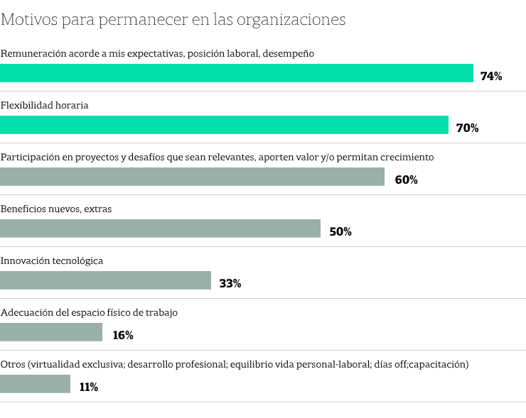 Sobre los motivos por los que permanecer en las organizaciones, en el informe de IDEA Joven se destaca que la remuneración debe ser acorde a sus expectativas, posición laboral o desempeño (74%). Sin embargo, se ve que la flexibilidad horaria (70%) y la participación en proyectos y desafíos que sean relevantes, aporten valor y/o permitan crecimiento (60%) ganan cada vez más protagonismo.