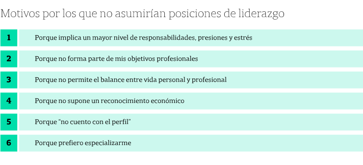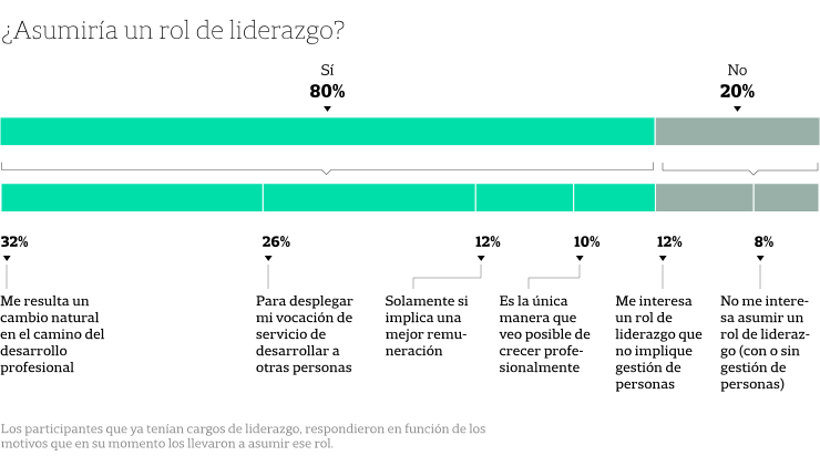Según el estudio de IDEA Joven, ante la pregunta sobre si asumirían un rol de liderazgo, el 80% de los jóvenes respondió que sí, ya que resulta un cambio natural en el camino del desarrollo profesional y es una forma de desplegar su vocación de servicio. Sin embargo, el 20% que contestó de forma negativa indicó que la posición de liderazgo implica un mayor nivel de responsabilidades, presiones y estrés; esto no forma parte de sus objetivos profesionales y no permite un balance entre vida personal y profesional.